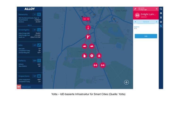 Die im August 2017 von Yotta vorgestellte neue Connected Asset Management Platform Alloy ist ab Januar 2018 auch in deutscher Sprache verfügbar. Behörden und Verwalter von Infrastruktur-Einrichtungen können ihre Anlagen damit sehr einfach in einer übersichtlich strukturierten Kartierung verwalten. Yotta stellt mit Alloy eine neue Lösung vor, die es Anwendern – zum Beispiel Behörden, öffentlichen Einrichtungen oder Versorgern – erlaubt, die Daten von Anlagen und Systemen in räumlichen Infrastrukturen miteinander zu verknüpfen. Die Lösung arbeitet auf Basis digitaler Landkarten oder Stadtpläne und verbindet die im städtischen Umfeld stark wachsende Anzahl von mit Sensoren ausgestatten Objekten – beispielsweise Beleuchtungsanlagen, Ampeln oder Versorgungseinrichtungen.