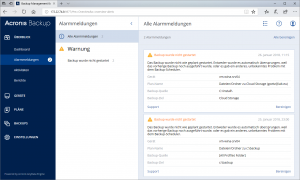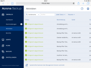 Loggt sich ein Anwender im laufenden Betrieb beim Management-Tool von Acronis Backup ein, so landet er auf einem Dashboard, das ihn über Alarmmeldungen, Aktivitäten und ähnliches informiert. Unter „Geräte“ erfolgt im Gegensatz dazu die eben beschriebene Konfiguration der Backup-Jobs. Auch Restore-Vorgänge lassen sich hier anstoßen, was im Test problemlos funktionierte.