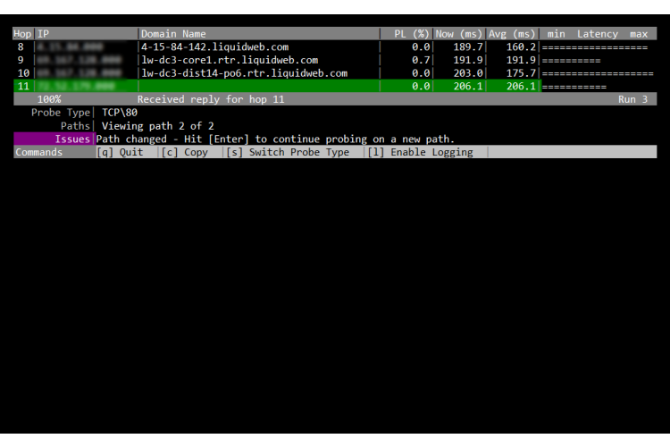 - Korrekte Pfadanalyse und Sichtbarkeit über CLI von der Quelle bis hin zum Bestimmungsort, mit der Möglichkeit, die Anzahl von Hops, entsprechende IP-Adressen, Hostnamen, Paketverlust und Latenz zu ermitteln
