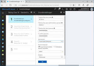 Möchte ein Administrator die Backup Exec-Lösung in Azure nutzen, so muss er zunächst im Marketplace nach „Backup Exec“ suchen und den entsprechenden Eintrag auswählen. Danach erhält er die Möglichkeit, seine neue VM zu konfigurieren, also einen Namen anzugeben, einen Administratorbenutzer mit Passwort anzulegen und eine Ressourcengruppe sowie eine Azure-Region zu selektieren.