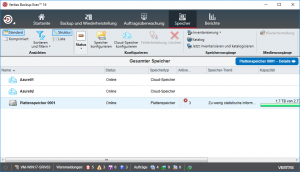 Unter „Speicher“ legen die Verantwortlichen ihre Backup-Ziele an, definieren also Cloud- und Festplattenspeicher. Darüber hinaus katalogisieren und inventarisieren sie bei Bedarf ihre Backup-Medien wie etwa Bänder. Abgesehen davon stellt die Software an gleicher Stelle auch für jeden definierten Speicher Informationen über die darauf abgelegten Backup-Sätze, die darauf ausgeführten Aufträge mit ihrem Verlauf, eventuelle Warnmeldungen und die Eigenschaften zur Verfügung. Zu letzteren gehören unter anderem der Gerätestatus, die maximale Dateigröße und der Pfad.