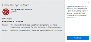 Zusätzlich zu der eben beschriebenen Option, Backup Exec in Verbindung mit Cloud-Storage auf Azure zu nutzen, gibt es im Azure Marketplace auch noch die Möglichkeit, automatisch eine Azure VM mit vorinstalliertem Backup Exec 16 zu erzeugen und diese dann direkt in Azure zu nutzen. In diesem Fall kommt Backup Exec mit einer 60 Tage-Testlizenz, soll das System über einen längeren Zeitraum zum Einsatz kommen, so sind die Anwender dazu in der Lage, eine eigene Lizenz einzuspielen (Bring your own License). Die „Backup Exec 16 – Standard Azure Solution“ kommt bereits mit dem Agenten für Anwendungen und Datenbanken und dem Agenten für Vmware und Hyper-V. Andere Optionen lassen sich direkt in der VM über die entsprechende Backup Exec-Utility nachinstallieren.