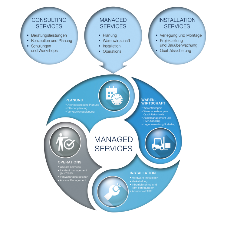 Immer stärker gefragt sind inzwischen auch „Managed Services“, bei denen Aufgaben ausgelagert werden, die der Kunde nicht selbst übernehmen kann oder will. Die Gründe dafür sind meist das fehlende Fachpersonal im eigenen Haus. Oft sind die Spezialisten aber auch anderweitig eingesetzt oder verfügen nicht über den notwendigen Grad an Know-How. Gerade für die Aufgaben rund um die passiven Elemente eines Rechenzentrums und die verschiedenen Belange in diesem Bereich bleibt erfahrungsgemäß häufig keine Zeit.