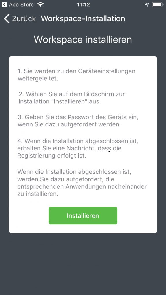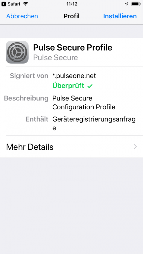 Nachdem die Mail auf unserem iPhone eingegangen war, klickten wir auf den darin enthaltenen Registrierungslink, woraufhin das System in den Apple App Store wechselte und auf dem Smartphone die Pulse Secure-App einspielte. Danach starteten wir diese App und gaben auf dem Willkommensbildschirm unsere E-Mail-Adresse und den in der Willkommensmail enthaltenen Aktivierungsschlüssel an. Jetzt mussten wir nur noch das BYOD-Policy-Agreement akzeptieren, der App erlauben, den Workspace zu installieren und dem Zertifikat vertrauen. Damit war der Prozess abgeschlossen und das iPhone erschien in der Übersicht der verwalteten Geräte.