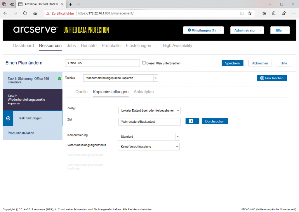 In der Praxis ergibt es keinen Sinn, Backups nur an einem Ort vorzuhalten. Deswegen ermöglich es die Arcserve Appliance, die Daten erstellter Backups automatisch auf andere Speichermedien zu kopieren. Dazu müssen die Administratoren lediglich auf den Sicherungs-Plan gehen, dessen Daten sie kopieren wollen und innerhalb der Plan-Konfiguration auf der linken Seite einen neuen Task hinzufügen. Der Task-Typ lautet in diesem Fall „Wiederherstellungspunkte kopieren“ und ermöglicht es, einen lokalen Datenträger, beispielsweise ein USB-Speichermedium, oder ein Netzwerk-Share beziehungsweise einen Cloud-Speicher als Kopierziel anzugeben. Im Test verwendeten wir zu diesem Zweck ein über einen UNC-Pfad definiertes Netzwerk-Share. Dabei traten keine Probleme auf. Über die Tasks lassen sich im Betrieb auch andere Aktionen durchführen, beispielsweise das Speichern der Backup-Daten auf Bandlaufwerken.