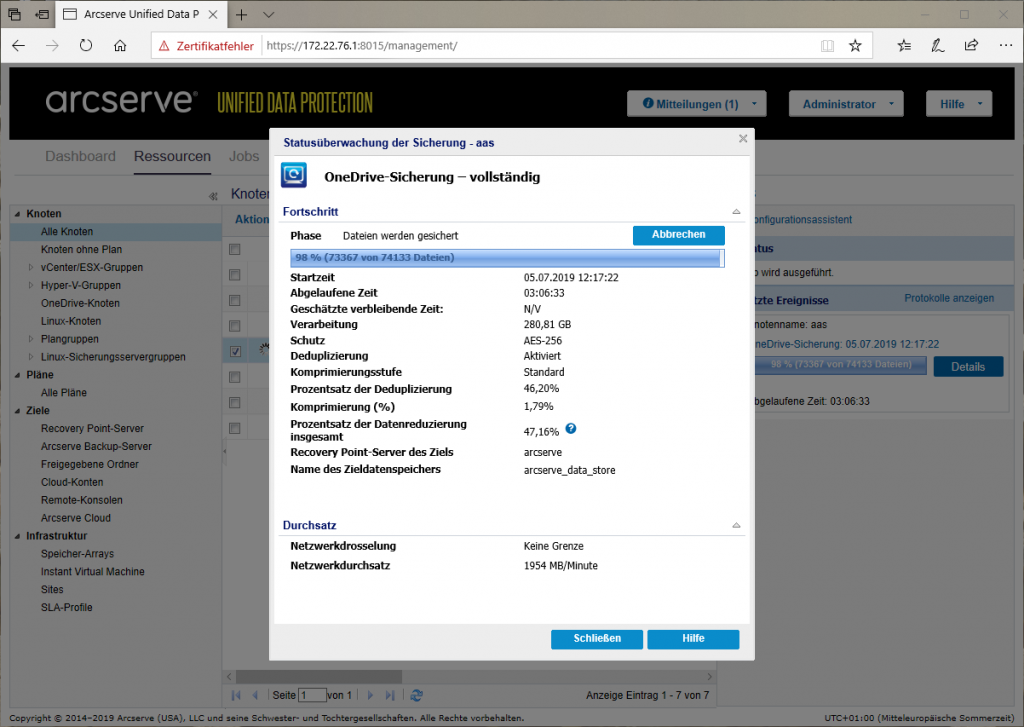 Dazu fügten wir den Server als Sicherungsknoten aus unserem Active Directory zu unserer Arcserve-Umgebung hinzu und richteten einen entsprechenden Sicherungsplan ein. Daraufhin installierte die Appliance, wie schon bei dem Windows 10 Client, zunächst den Agenten auf dem zu schützenden Rechner und führte dann das Backup aus. Das Sichern von Windows-Rechnern stellt damit offensichtlich kein Problem dar.