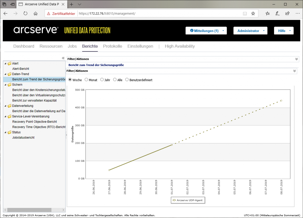 Eine Backup-Lösung wäre wenig wert, wenn die Administratoren über ihre Aktionen im Unklaren blieben. Deswegen bietet die Arcserve Appliance nicht nur ein Dashboard mit aktuellen Informationen zum Status der Aufgaben, zur Zahl der Wiederherstellungspunkte und ähnlichem, sondern auch leistungsfähige Analyse- und Reportwerkzeuge. Letztere geben beispielsweise Aufschluss über den Trend bezüglich der Sicherungsgrößen, damit die zuständigen Mitarbeiter sehen, wie lange der vorhandene Backup-Speicher ausreicht.