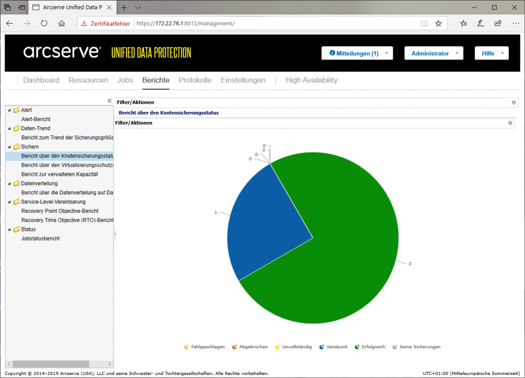 Außerdem gibt es grafisch illustrierte Berichte, die zeigen, wie der Sicherungsstatus der im Netz vorhandenen Knoten aussieht und beispielsweise darauf hinweisen, wenn Sicherungen versäumt oder abgebrochen wurden. Genauso sind die Verantwortlichen unter anderem dazu in der Lage, den belegten Speicherplatz einzusehen oder auf die Systemprotokolle zuzugreifen.