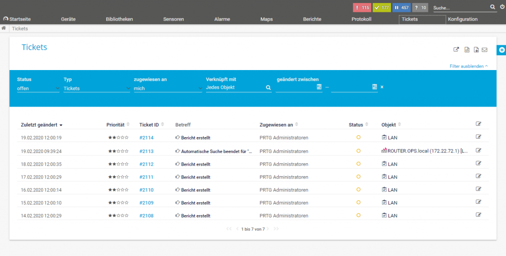 Da PRTG ja das Netz überwacht und Probleme erkennen und melden kann, ergibt es Sinn, auch gleich eine Möglichkeit in die Software einzubauen, die dabei hilft, die Lösungen der aufgetretenen Probleme zu organisieren. Deswegen verfügt PRTG auch über ein Ticket-System. Dieses lässt sich nutzen, um bestimmten PRTG-Benutzern Aufgaben zuzuweisen. Sowohl die Anwender als auch PRTG selbst sind dazu in der Lage, Tickets anzulegen. Tickets können auch über Benachrichtigungen über ungewöhnliche Ereignisse erzeugt werden. Falls gewünscht kann das System die User auch per Mail über neue Tickets, die sie betreffen, informieren. Sobald das jeweilige Problem gelöst wurde, schließt der zuständige Mitarbeiter das Ticket und die Aufgabe gilt als abgeschlossen. Im Test funktionierte das einwandfrei.