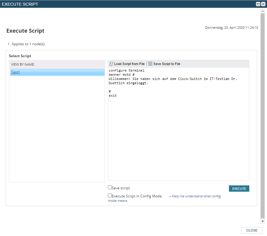 Im Test fingen wir klein an, und modifizierten zunächst einmal das Login-Banner unseres Switches mit Hilfe eines Skripts. Dazu wechselten wir zunächst im Konfigurationsinterface nach „Meine Dashboards / Netzwerkkonfiguration / Configuration Management“ und klickten auf den „Script Management“-Reiter. Anschließend wählten wir den Befehl „Add New Script“ aus. Daraufhin öffnete sich ein Editor mit nummerierten Zeilen, in dem wir unser Skript eintragen konnten. Nachdem wir es komplettiert und abgespeichert hatten, konnten wir es über den Befehl „Execute Script“ direkt ausführen. Dieser fragt zuerst, auf welchen Geräten das Skript laufen soll und möchte dann wissen, welches Skript zu starten ist. Anschließend führt er das Skript dann aus. Im Test traten dabei keinerlei Probleme auf.