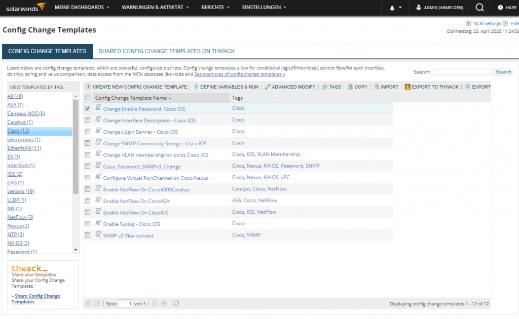 Nachdem wir unsere Umgebung inventarisiert hatten, konnten wir uns mit den eben genannten Templates auseinandersetzen. Wie der Name schon vermuten lässt, handelt es sich dabei um Vorlagen, mit denen sich typische Konfigurationsaufgaben automatisiert abarbeiten lassen. SolarWinds stellt im Rahmen des NCM 48 Templates, geordnet nach Herstellern und Aufgabengebieten, also beispielsweise 12 Templates für Cisco, 19 Templates für Lenovo, drei NetFlow-Templates und so weiter, bereit. Es ist auch möglich, eigene Templates zu erstellen und über die Web-Plattform „THWACK“ (https://thwack.solarwinds.com) Templates mit anderen Nutzern auszutauschen. Dort befinden sich hunderte weiterer Vorlagen für die verschiedensten Aufgaben oder Hersteller zum Download.