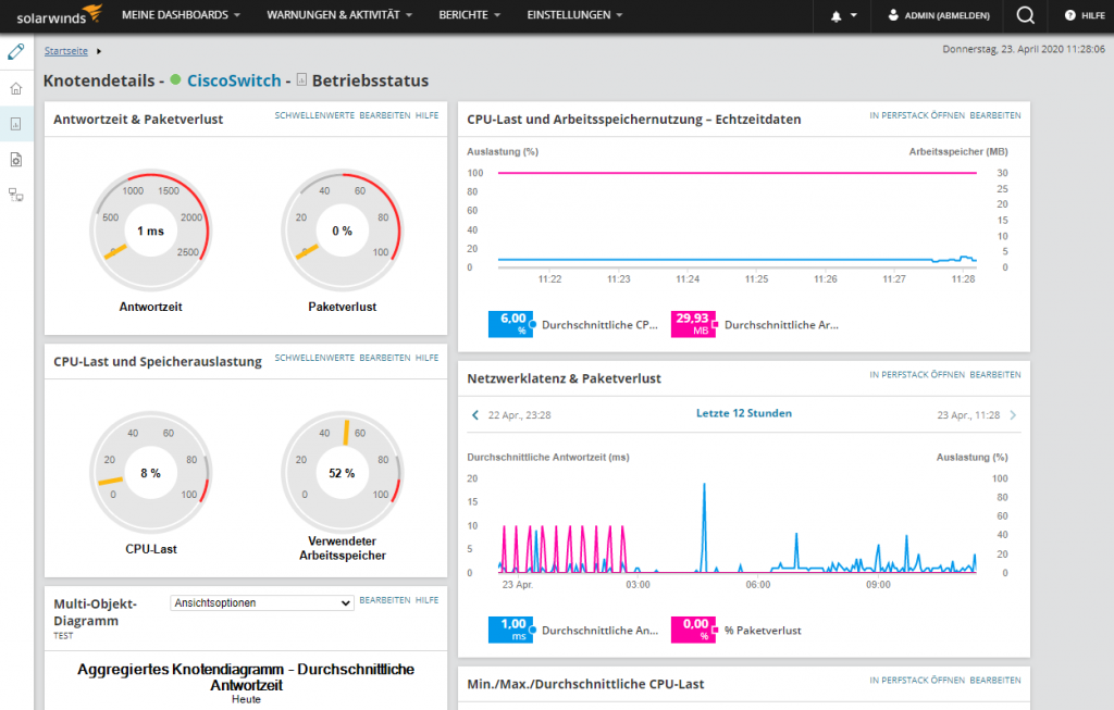 Die Daten, die die Inventory-Scans sammeln, können zusätzlich auch in Reports einfließen. Die Scans lassen sich entweder über alle Nodes hinweg, über Node-Gruppen oder über einzelne Nodes durchführen. SolarWinds empfiehlt in diesem Zusammenhang einen täglichen Inventory-Scan über alle Systeme hinweg in der Nacht. Bei Bedarf sind die Administratoren aber auch in der Lage, die Scans manuell anzustoßen, und zwar unter „Meine Dashboards / Netzwerkkonfiguration / Configuration Management“. Dort wählen sie das jeweils betroffene Gerät aus und klicken dann auf „Update Inventory“. Im Test führten wir zu diesem Zeitpunkt einen Scan durch und erstellten anschließend einen Inventory Report, um die Ergebnisse einzusehen. Dabei traten keine Überraschungen zu Tage. Auf die Reports gehen wir später auch noch genauer ein.