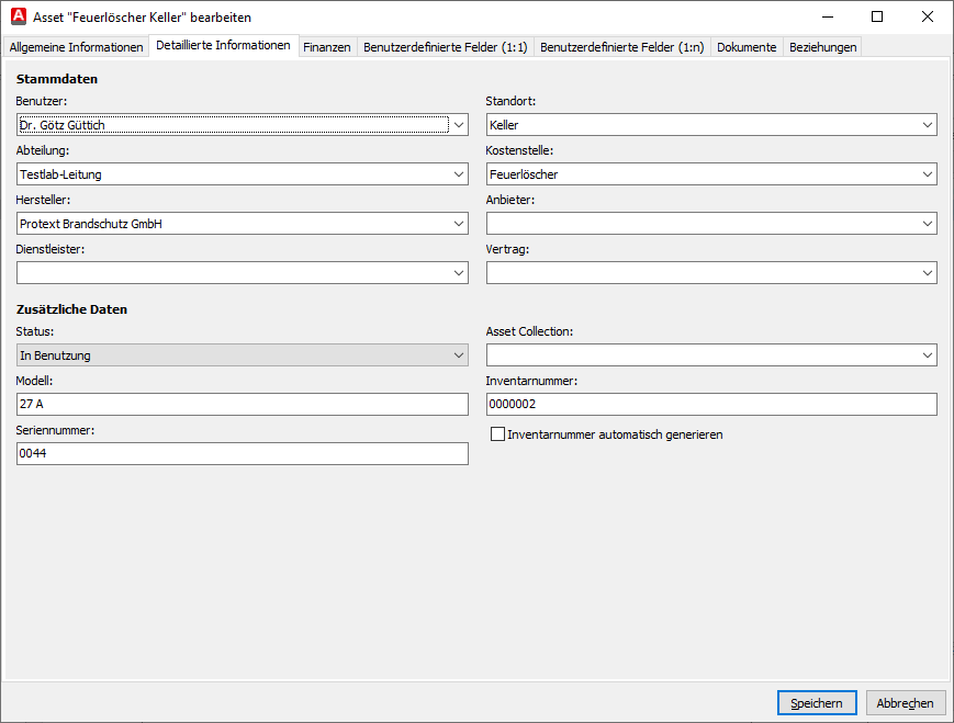 Im nächsten Schritt geht es an die Angabe der Stammdaten mit „Benutzer“, „Abteilung“, „Hersteller“, „Dienstleister“, „Standort“, „Kostenstelle“, „Status“, „Modell“, „Seriennummer“ und Ähnlichem. Hierbei fällt positiv auf, dass die Benutzer jederzeit beliebige Informationen hinzufügen können. Fällt zum Beispiel beim Anlegen eines Assets auf, dass der dazugehörige Hersteller oder der Standort noch nicht in der Datenbank vorhanden sind, so müssen die zuständigen Mitarbeiter die Asset-Erstellung nicht unterbrechen, um einen entsprechenden Eintrag in der Hersteller- oder Standortübersicht anzulegen, sondern können die dafür benötigten Schritte direkt über den Assistenten zur Asset-Erzeugung mit erledigen. Das macht die ganze Sache sehr einfach und beschleunigt das Arbeiten deutlich.