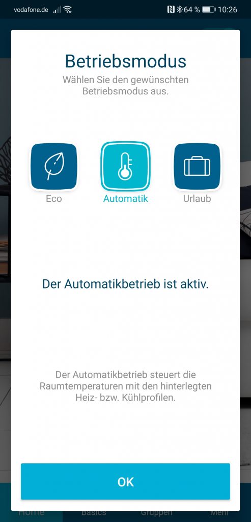 Neben dem automatischen Betriebsmodus mit den vorher definierten Heizprofilen gibt es noch vier andere Modi, die die Anwender nutzen können. Der erste nennt sich “Eco” und regelt alle Heizkörper auf eine zuvor definierte Absenktemperatur herunter. Der zweite, “Manuell”, belässt die Heizkörper auf einer festen Temperatur. Beim “Party Modus” setzt das System das laufende Profil aus. Auf diese Weise werden Heizungen beispielsweise am Abend nicht heruntergefahren, sondern laufen weiter. Später wechselt das System dann automatisch in das Automatikprogramm zurück. Zu guter Letzt kommt noch der “Urlaubsmodus”: Hier hält das System bis zu einem bestimmten Datum eine zuvor eingestellte Temperatur und wechselt danach ebenfalls ins Automatikprogramm zurück.
