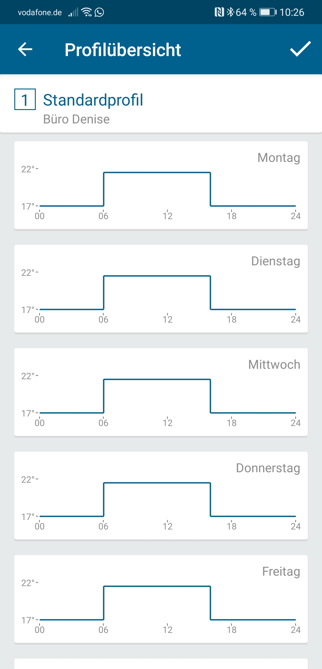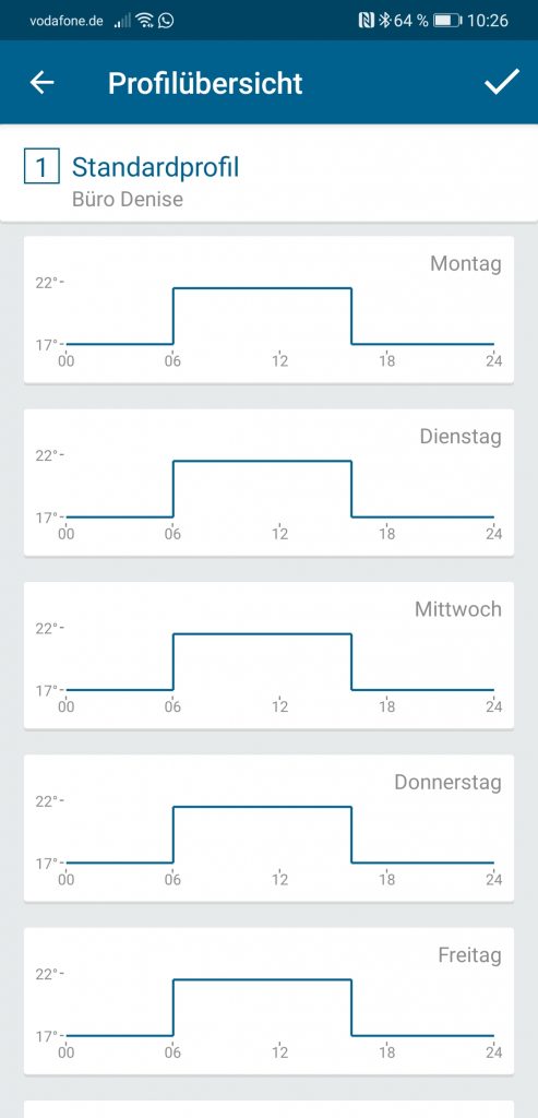 Im laufenden Betrieb können die Anwender die Heizungstemperatur über die App oder einen Regler direkt am Thermostaten anpassen. Außerdem ist es auch möglich, in der App Heizprofile anzulegen. Das ergibt Sinn, wenn im Verlauf des Tages unterschiedliche Raumtemperaturen gewünscht werden. So wird es beispielsweise in den meisten Fällen so sein, dass die Anwender es gerne morgens und abends im Badezimmer warm haben. Tagsüber und während der Nacht kann in dem Raum aber durchaus eine niedrigere Temperatur vorherrschen. Über die Heizprofile legen die Benutzer fest, welche Temperatur in welchem Raum zu welcher Tageszeit an welchem Tag herrschen soll. Es gibt ein Standardprofil und zwei Alternativprofile, die beispielsweise bei unterschiedlichen Arbeitsschichten oder Ähnlichem zum Einsatz kommen können. Die Profile werden nach der Konfiguration übrigens direkt im Thermostaten abgespeichert, so dass die Lösung auch dann funktioniert, wenn kein Internet vorhanden ist und der Access Point nicht läuft.