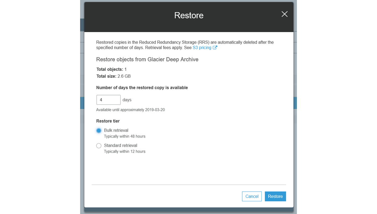 Für den Fall, dass ein Objekt doch einmal aus dem Langzeitarchiv geladen werden muss, klicken Sie im Actions-Menü der Konsole auf Restore. Im darauf erscheinenden Dialog geben Sie die Anzahl der Tage an, für die das Objekt ohne Verzögerung abrufbereit erscheinen soll. Beim Wiederherstellen haben Sie die Wahl zwischen zwei Varianten. Das Bulk retrieval ist preisgünstiger und dauert bis zu 48 Stunden. Beim Standard retrieval ist die Wiederherstellung innerhalb von zwölf Stunden abgeschlossen.