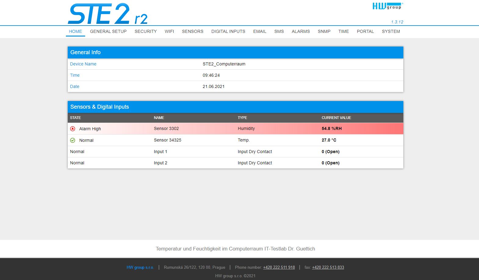 Verbindet sich der Administrator mit dem Web-Interface des STE2 R2, so landet er auf einer Übersichtsseite, die Informationen über den Gerätenamen, die Zeit, das Datum und die aktuellen Sensorwerte umfasst. Die anderen Bereiche des Web-Interfaces stehen, nachdem einmal ein Passwort gesetzt wurde, nur nach einem Login zur Verfügung.
