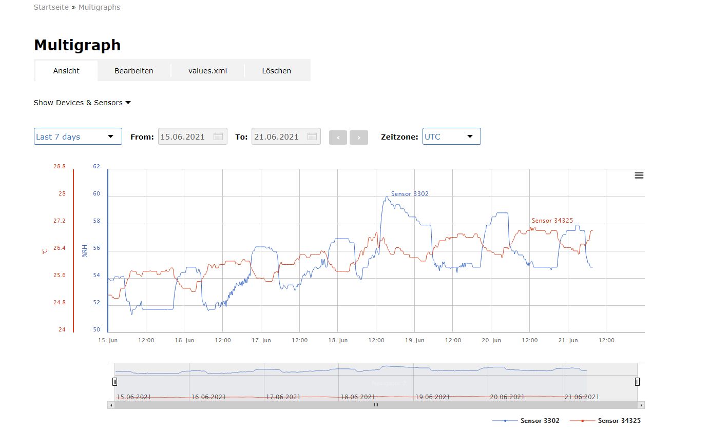 Unter „Sensors“ kann man ebenfalls auf die Sensoren und ihre Werte zugreifen, außerdem gibt es bei Sensdesk auch noch die Option, Orte zu definieren und Geräte zu Gruppen zusammenzufassen. Zusätzlich von Interesse: Die „Multigraphs“ ermöglichen das Zusammenfassen von mehreren Sensorwerten in einer Grafik. Sie sorgen so für einen schnellen Überblick.