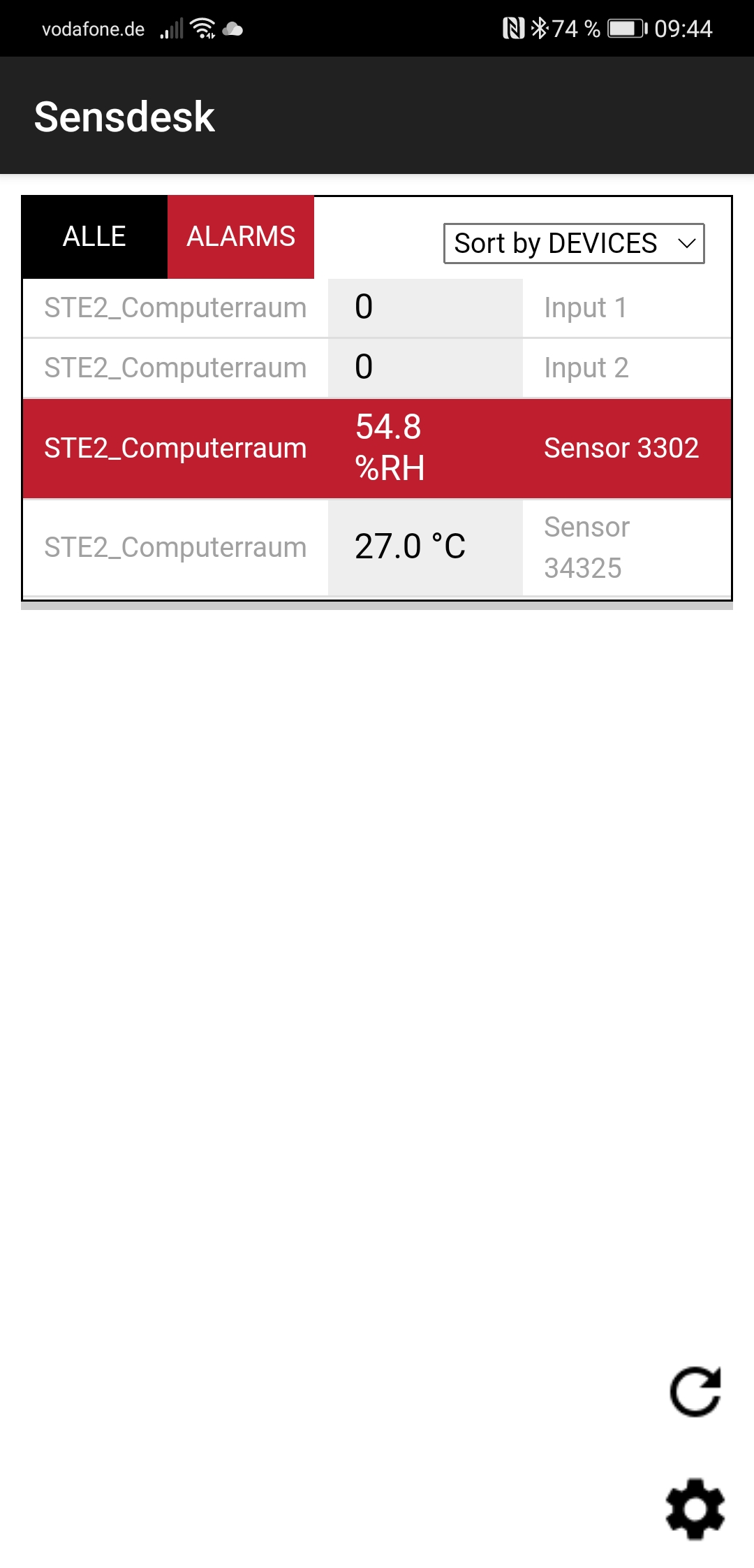 Nachdem unser STE2 R2 mit der Cloud kommunizierte, konnte wir zum Abschluss des Tests noch die App einrichten. Dazu luden wir sie aus dem Play Store auch unser Huawei Mate 20 herunter (sie heißt „Sensdesk Mobile“, es existiert auch eine iOS-Version) und loggten uns mit den bereits erwähnten Team-Zugangsdaten, die wir auch im Web-Interface der Appliance verwendet hatten, bei dem Cloud-Dienst ein. Danach präsentierte uns die recht minimalistisch gehaltene App die aktuellen Sensorwerte auf unserem Smartphone.