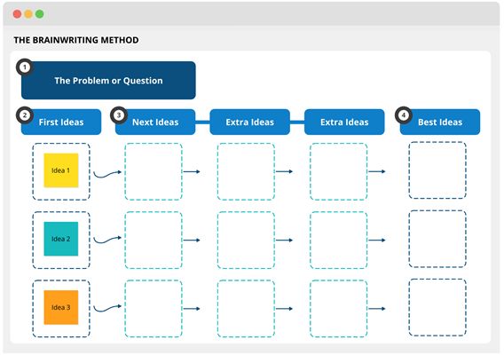 Eine Möglichkeit jede und jeden mit einzubeziehen liegt im Brainwriting. Das funktioniert so: Damit keine guten Ideen im Verborgenen bleiben, schreiben alle, ähnlich wie bei den “Crazy Eight”, erst mal ihre Ideen auf. Nach einer gewissen Zeit, etwa fünf Minuten, werden die eigenen Ideen an das nächste Teammitglied weitergereicht. So können die Ideen aus vielen verschiedenen Perspektiven beleuchtet und weiterentwickelt werden. Brainwriting wurde entwickelt, um effizient Ideen auszuarbeiten und allen Beteiligten eine Chance zu geben ihren Gedanken Ausdruck zu verleihen. So können Prozesse beschleunigt und soziale Ängste reduziert werden. Einzelne Personen erhalten dabei keine Gelegenheit, die Diskussion zu dominieren und andere daran zu hindern, ihre eigenen Ideen einzubringen. Ein weiterer wesentlicher Vorteil der Verschriftlichung: Am Ende des Meetings haben alle das Ergebnis direkt vor Augen. Auch hier hilft wieder ein strukturiertes Template in einem Visual Collaboration Tool. So ist der Entstehungsprozess beziehungsweise Gedankenweg hinter den Ideen direkt nachvollziehbar. Die Möglichkeit, Skizzen oder Bilder hinzuzufügen, kann das Erarbeitete noch verdeutlichen.