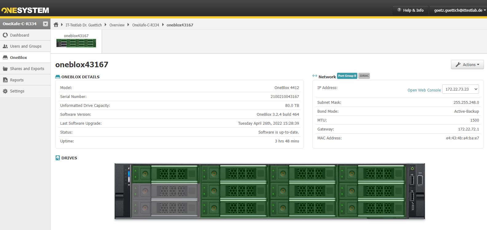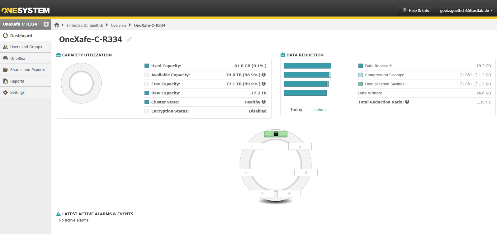 Nachdem wir unseren Cluster erstellt hatten, wechselten wir nach Management, um unsere Appliance mit dem OneSystem-Managementwerkzeug in der Cloud zu verbinden. Dazu mussten wir die URL https://onesystem.exablox.com als OneSystem-URL eintragen. Danach meldeten wir uns mit unserem zuvor angelegten Konto bei OneSystem an und wechselten in der Seite „Overview“ nach „Actions /Register New Rings“. Daraufhin erschien ein Fenster, das sich „Discover OneBlox“ nannte. Dort hatten wir dann die Möglichkeit, die Appliance automatisch finden zu lassen und zu dem System hinzuzufügen, oder das Gerät über seine IP-Adresse einzubinden. Im Test fand das Managementwerkzeug die Appliance sofort und zeigte einen Passcode an. Diesen mussten wir in das Textfeld unter der Grafik eingeben, danach war es nur noch erforderlich, auf „Registrieren“ zu gehen. Jetzt war die Appliance an OneSystem angebunden und konnte über das Web-basierte Tool verwaltet werden.