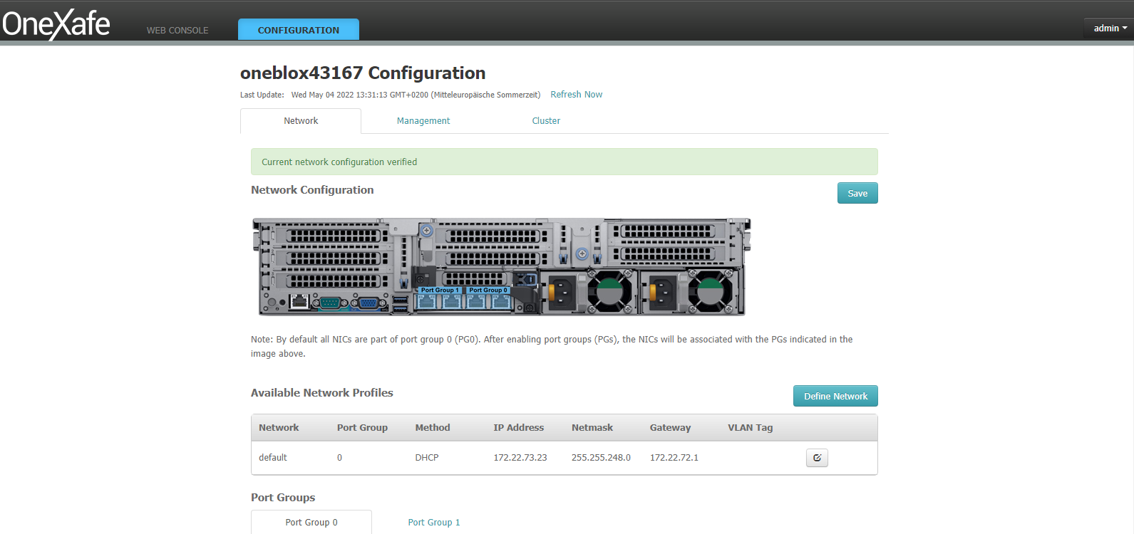 Nach dem Login landet man im Netzwerkkonfigurationsbereich der Appliance. Dieser erlaubt das Anlegen von Netzwerkprofilen, die Arbeit mit Portgruppen sowie das Setzen von Proxy-Server-, NTP-Server und DNS-Server-Einstellungen.