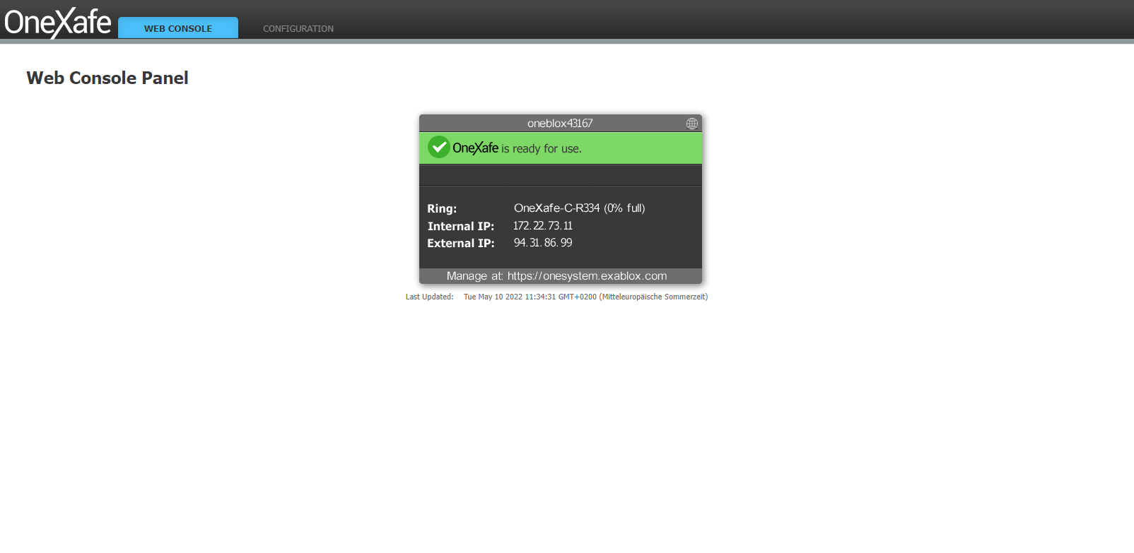 Als wir das Konto eingerichtet hatten, verbanden wir die Appliance, die bei unserem Testgerät auf Dell-Server-Hardware aufsetzte (es gibt auch eine Variante auf Basis von Supermicro-Servern) mit dem Netz und fuhren sie hoch. Dabei konnten wir sehen, dass als Betriebssystem der Lösung CentOS zum Einsatz kommt. Während des Boot-Vorgangs holte sich das Produkt eine IP-Adresse von unserem DHCP-Server und war anschließend über die URL http://{IP-Adresse der Appliance} im LAN ansprechbar. Ruft man diese Adresse auf, so landet man auf einer Seite, die anzeigt, dass die Appliance betriebsbereit ist und auch meldet, wenn Fehler aufgetreten sind. Wechselt man auf dieser Seite auf den Reiter „CONFIGURATION“, so kann man sich mit Benutzername und Password bei der Appliance einloggen. Die Standardzugriffsdaten lauten „admin“ und „config“.