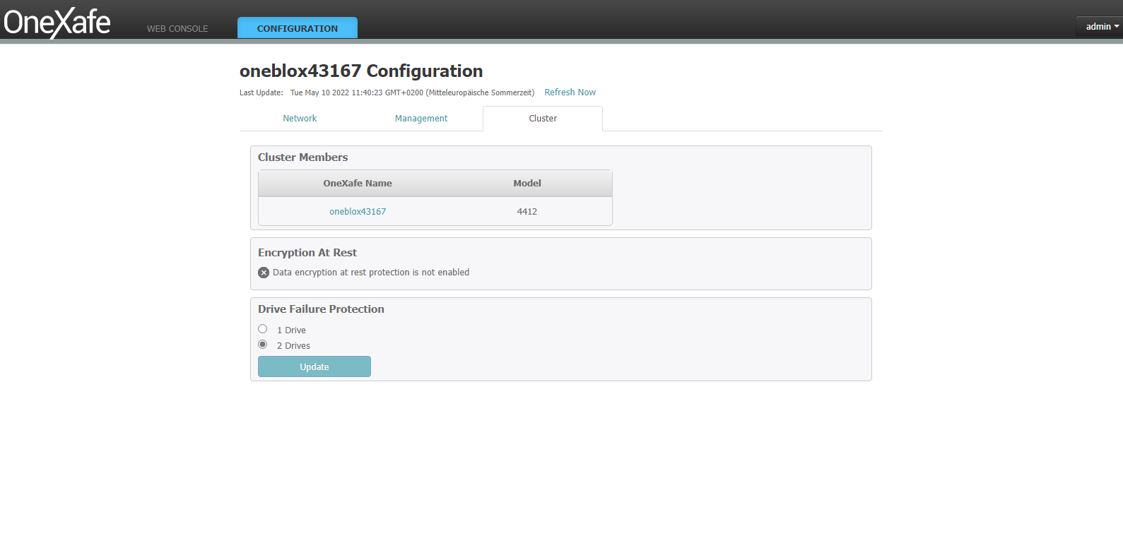 Am oberen Bildschirmrand finden sich noch zwei weitere Reiter, namens „Cluster“ und „Management“. Unter Cluster haben die zuständigen Mitarbeiter die Option, Storage-Cluster anzulegen, die sich über mehrere Festplatten erstrecken. Im Test banden wir alle vorhandenen HDDs in unseren Cluster ein und aktivierten auch gleich die „Data Encryption at Rest Protection“.