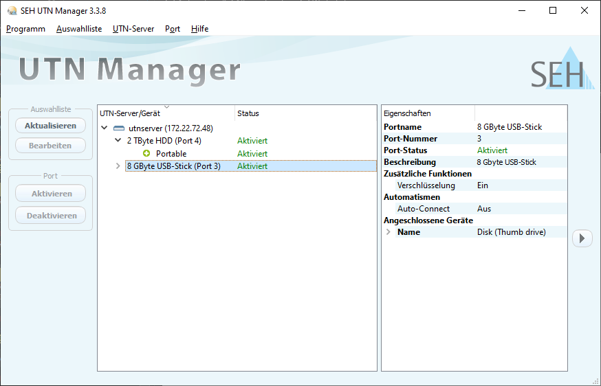 Um die an den utnserver angeschlossenen USB-Devices auf den Endpoints nutzen zu können, kommt der “SEH UTN Manager” zum Einsatz. Diese Software steht für Linux, MacOS und Windows zur Verfügung, ihr Download findet sich ebenfalls unter https://www.seh-technology.com/services/downloads/download-deviceserver/utnserver-promax.html.