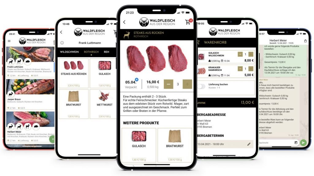 Über Waldfleisch: Das 2021 gegründete Startup wurde vom Bundeswirtschaftsministerium gefördert und wird vom Deutschen Jagdverband unterstützt. Im April 2021 startete die App in einem Pilotprojekt in Niedersachsen. Inzwischen können Verbraucher in ganz Deutschland sehen, welche Produkte Jäger in ihrer Region gerade verfügbar haben. Mit über 200.000 Downloads ist Waldfleisch mit Abstand die größte digitale Plattform für Wildfleisch-Direktvermarktung.