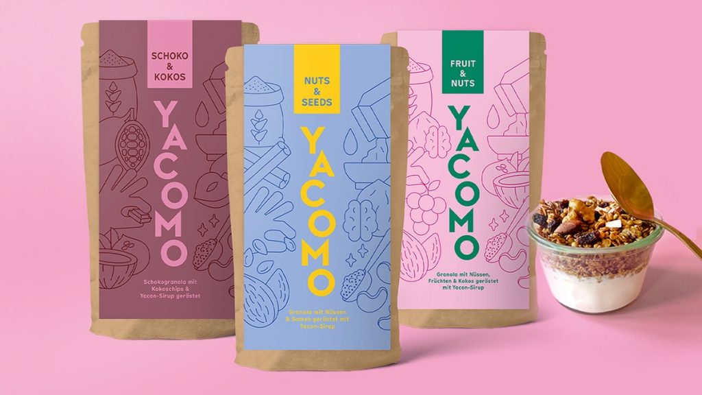 Als natürliche Proteinquellen im Müsli dienen geröstete Nüsse und Samen sowie Yacon-gesüsste Protein-Soja-Crispies. Yacomo Granola wird in drei Sorten gelauncht: Die nussig-süss-salzige Sorte „Nuts & Seeds“, die exotisch angehauchte „Fruit & Nuts“ Sorte mit Weinbeeren und gerösteten Kokoschips und die schokoladige Sorte „Choco & Cocos“, die mit Birkenzucker gesüßten Schokostückchen und schokoladig gerösteten Yacon Nüssen auftrumpft.