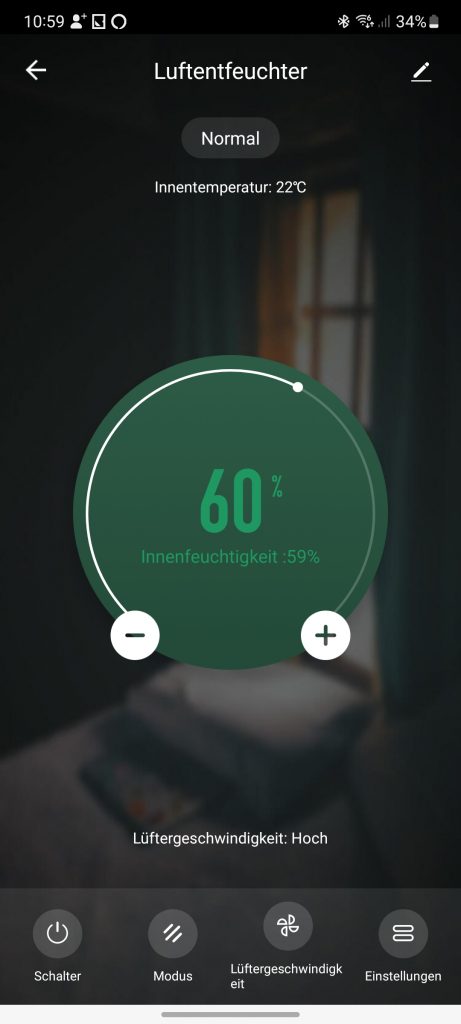 Im Betrieb ermöglicht es die Elesion-App, einen Zeitplan zu setzen, an dem sich der Luftentfeuchter automatisch ein- und ausschaltet. Außerdem besteht auch die Option, das Gerät manuell ein- und auszuschalten, die Lüftergeschwindigkeit und die gewünschte Luftfeuchtigkeit anzupassen, den Modus zu wechseln und die Kindersicherung zu aktivieren beziehungsweise zu deaktivieren. Abgesehen davon zeigt die Statusseite des Geräts an, wie hoch die Luftfeuchtigkeit gerade ist, welche Zielluftfeuchtigkeit eingestellt wurde und welche Temperatur in dem betroffenen Raum herrscht.