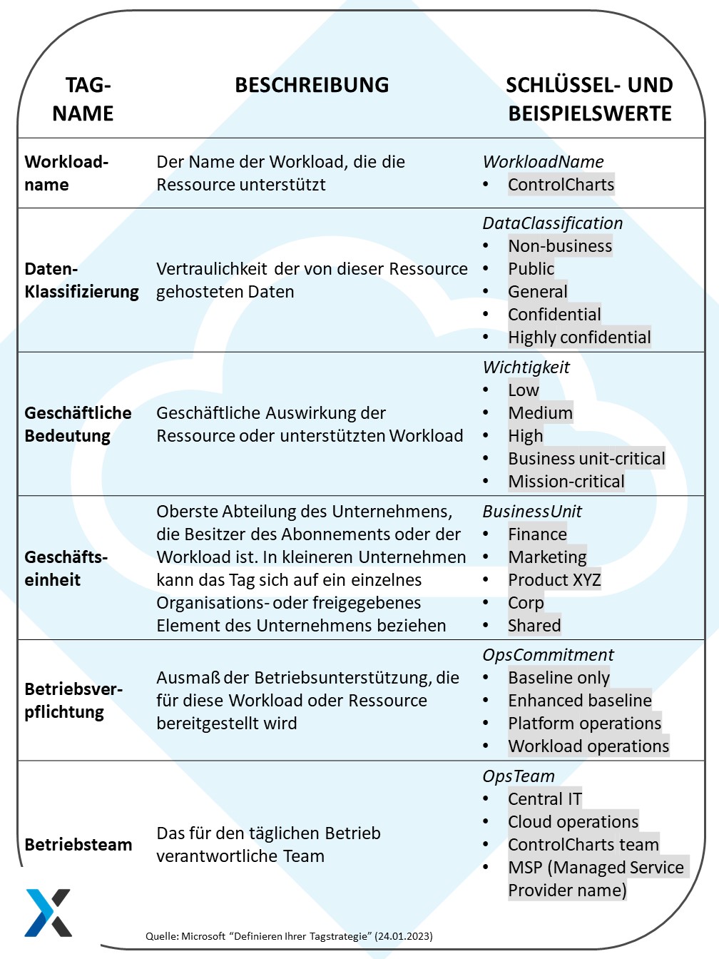 Es gibt zwei verschiedene Arten von Tags. Die von Cloud-Anbieter wie AWS, Google oder Azure zugewiesenen Tags (beispielsweise Instanz-ID) sind vordefiniert, unveränderbar und enthalten oft lange, bisweilen sehr kryptische Zeichenfolgen (zum Beispiel sfr-02fe435ca). Darüber hinaus können Unternehmen eigene, benutzerdefinierte Tags vergeben. Bei der Ausformulierung sind die Verantwortlichen (relativ) frei. In den letzten Jahren haben sich jedoch einige Best Practices etabliert. Templates und Leitfäden für das Cloud-Tagging finden sich unter anderen bei den großen Cloud-Anbietern. Die vorgeschlagenen Tags in der hier eingebundenen Tabelle folgen beispielsweise den von Microsoft empfohlenen Mindestkennzeichnungen für Cloud-Ressourcen.