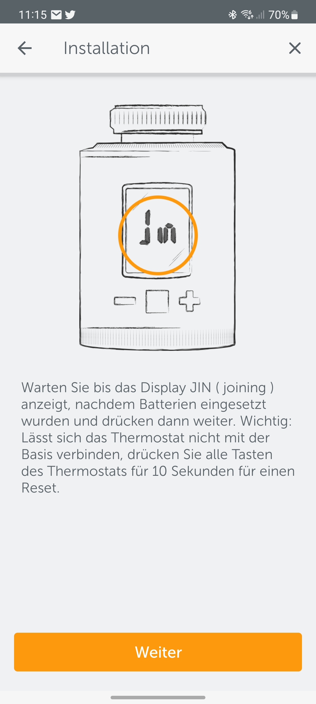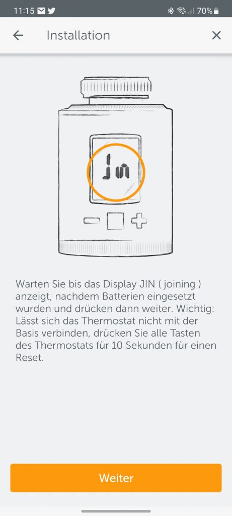 Beim “Thermostat ONE X” ist die Prozedur vergleichbar. Nach dem Einlegen der Batterien müssen die Anwender das Thermostat zunächst wieder in die Nähe der Base bringen und dann das Plus-Symbol in der App drücken. Danach wählen sie als Sensortyp „Thermostat“ aus und drücken auf „Weiter“, wenn im Display des Thermostaten „Jin“ (also „Joining“) angezeigt wird. Sollte die Verbindungsaufnahme nicht funktionieren, so müssen die Benutzer alle Tasten des Thermostats für zehn Sekunden drücken, um einen Reset durchzuführen.