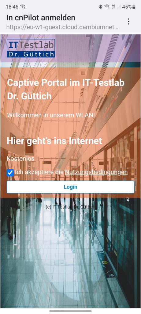 Nachdem wir die Konfiguration unserer Geräte abgeschlossen hatten und alles zu unserer Zufriedenheit funktionierte, machten wir uns daran, ein Captive Portal einzurichten, das den Zugriff auf unser WLAN absichern sollte. Cambium unterstützt in diesem Zusammenhang Captive Portals für kostenlose WLANs, für WLANs, bei denen der Zugriff mit Vouchern ermöglicht wird und für kostenpflichtige WLANs, beispielsweise durch Bezahlungen via Paypal, IPpay oder QuickPay.