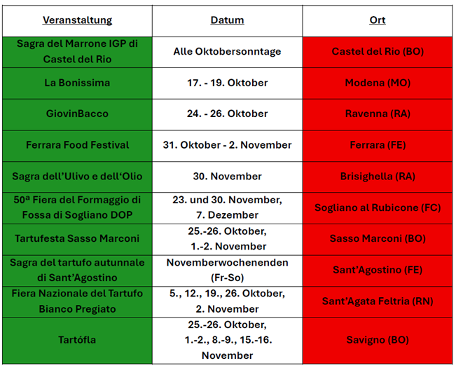 In Italien heißen sie „Sagre“ – liebevoll organisierte Dorffeste, bei denen ganze Orte ihre Ernten und Spezialitäten zelebrieren. Nirgendwo wird diese Tradition so authentisch gelebt wie in der Emilia-Romagna, dem Herzen der italienischen Genusskultur. Mit 44 Produkten, die ein EU-Siegel tragen (g.U./DOP und g.g.A./IGP), gilt die Region als „Food Valley“ Italiens. Besonders im Oktober und November entfaltet sich hier eine einzigartige Vielfalt an Festen, die Trüffel, Kastanien, Olivenöl oder Fossa-Käse in den Mittelpunkt stellen – regional, handwerklich und immer nah an den Produzenten.