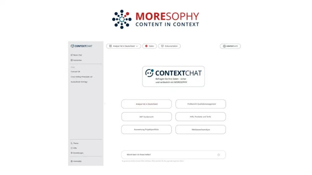 Der Münchener KI-Spezialist moresophy stellt mit ContextChat eine KI-Anwendung vor, die den direkten Dialog mit unternehmensinternen Daten ermöglicht. Mitarbeitende erhalten präzise, nachvollziehbare Antworten auf Basis ihres eigenen Unternehmenswissens – per natürlicher Sprache und ohne Systembrüche. Die Lösung ist Teil der ContextSuite und greift systemübergreifend auf strukturierte und unstrukturierte Daten zu. Grundlage ist die zum Patent angemeldete hybride DAPHY®-Technologie, die analytische und generative KI kombiniert und so Transparenz, Steuerbarkeit und Datensouveränität sicherstellt. ContextChat kann on premise oder in souveränen Cloud-Umgebungen betrieben werden und eignet sich besonders für regulierte Branchen.