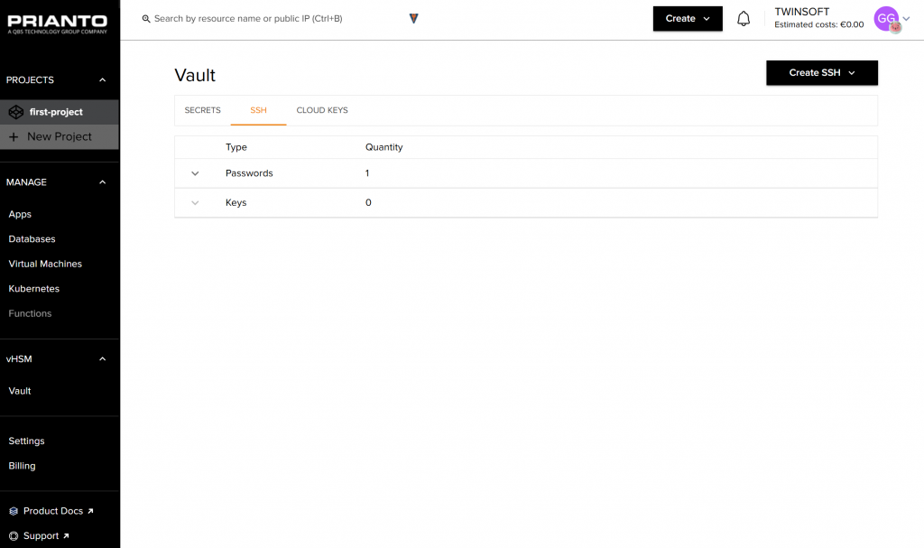 Die Credentials für Apps und Datenbanken, sowie für SSH-Zugänge und die Cloud-API-Keys werden über den Eintrag „Vault“ im Menü „vHSM“ verwaltet. Unter „Settings“ lassen sich Teams einrichten, API-Keys für Azure, AWS und GCP eintragen und Usage-Quotas für die genannten Cloud-Provider festlegen. Der Billing-Bereich ermöglicht es, die aktuellen Kosten und die Billing-History anzuzeigen und Billing Alerts zu definieren. Links zur Dokumentation und zum Support schließen den Leistungsumfang des Web-Interfaces ab.