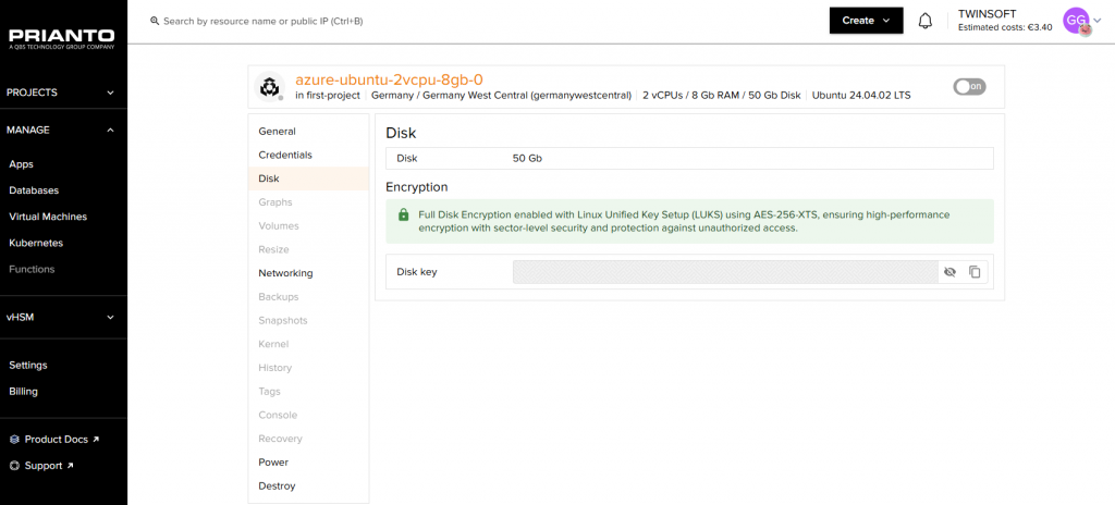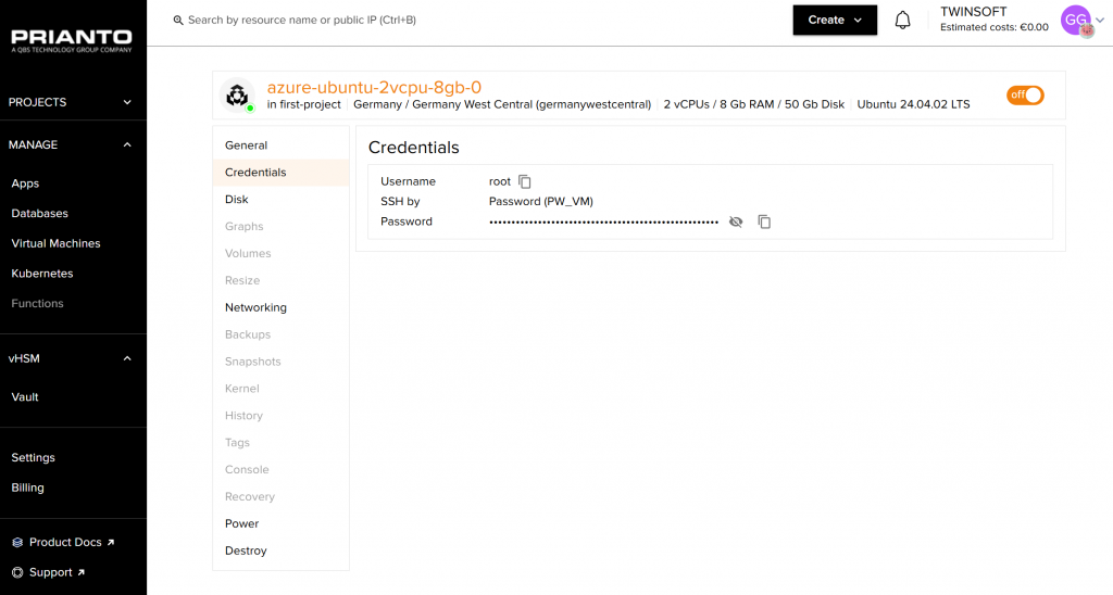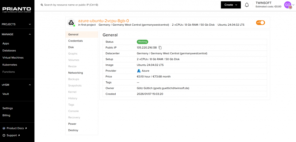 Wechseln die Verantwortlichen auf den Eintrag einer VM, so landen sie in einer Übersicht, die Aufschluss über den Status der VM (beispielsweise „Working“), die verwendete öffentliche IP-Adresse, das zum Einsatz kommende Rechenzentrum und das Setup mit CPUs, RAM und Disk gibt. Dazu kommen das verwendete Image (in unserem Fall Ubuntu 24.04.02 LTS), der Provider, die stündlichen und monatlichen Kosten, der Eigentümer, das Erstellungsdatum und eventuell vergebene Tags.
