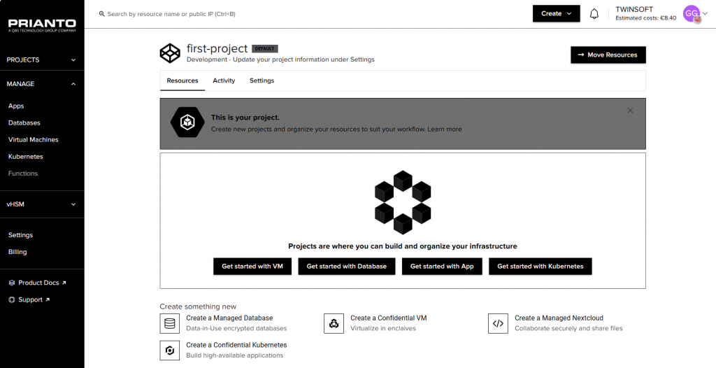 Loggt sich ein User beim Web-Interface der Lösung ein (uns stellte für diese Analyse der Enclaive-Partner „Prianto“ einen entsprechenden Zugang zur Verfügung), so landet er in einer Übersicht der existierenden Kundenprojekte. Hier hat er die Möglichkeit, Projekte anzulegen und zu verwalten.