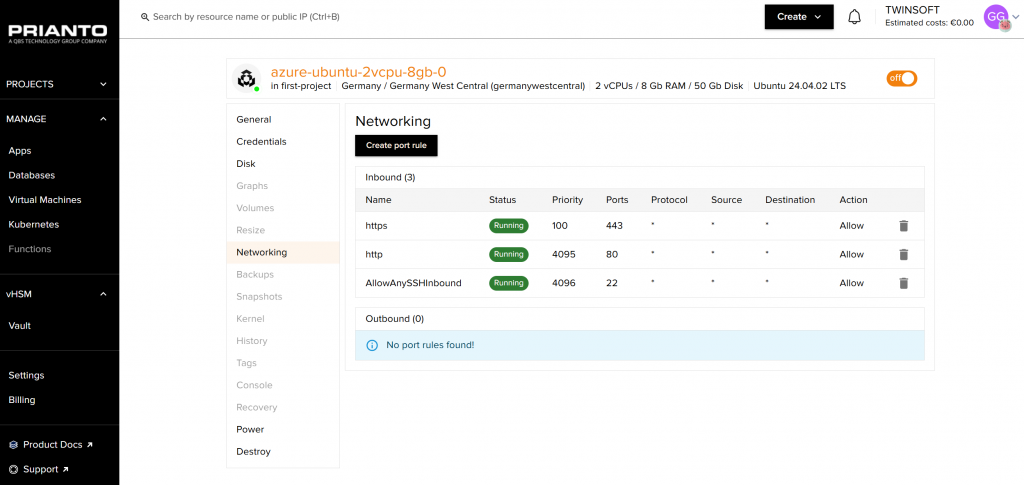Auf der linken Seite befindet sich ein Menübereich, in dem sich noch andere Funktionen aufrufen lassen. Dazu gehören die verwendeten Credentials, die Disk mit dem eingesetzten Verschlüsselungs-Key, die Möglichkeit, die VM ein- und auszuschalten beziehungsweise zu löschen und die Netzwerkeinstellungen. Letztere lassen sich nutzen, um Firewall-Regeln anzulegen, die die Kommunikation der VM mit dem Internet steuern. Standardmäßig ist eingehender SSH-Verkehr zugelassen, damit sich die zuständigen Mitarbeiter mit der Konsole verbinden können. Im Test gaben wir auch noch den Zugriff auf unseren Web-Server frei, damit man ihn von überall aus nutzen konnte. Dabei traten keinerlei Probleme auf.