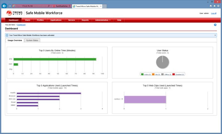 Loggt sich ein Administrator im laufenden Betrieb bei dem Safe Mobile Workforce Server ein, so landet er zunächst in einer Dashboard-Übersicht, die ihm die fünf Top-User, den Benutzerstatus (Active, Idle, Offline, Disabled), die Top 5-Apps und die Top 5-Web Clips anzeigt. Die Web-Clips bieten die Möglichkeit, URL-Schnellzugriffe auf Webseiten oder Sharepoint-Inhalte bereit zu stellen.