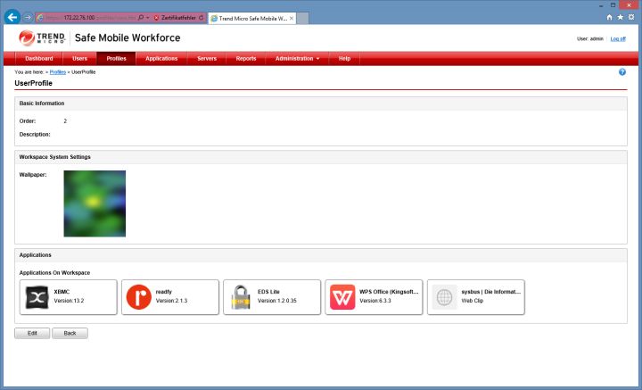 Nachdem das Setup durchgelaufen war, konnten wir uns mit den Standard-Credentials „admin/admin“ über die URL https://{IP-Adresse des Management-Interfaces} beim Safe Mobile Workforce Server anmelden. Danach mussten wir erst einmal unseren Produkt-Key eingeben, um das System zu aktivieren. Anschließend änderten wir das Passwort zum Zugriff auf das Verwaltungsinterface, um das System besser abzusichern. Danach wendeten wir uns der Funktionalität der Lösung zu.