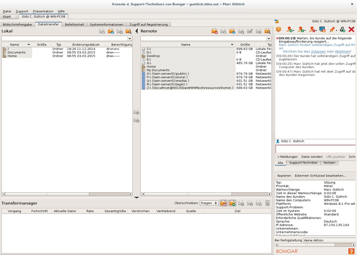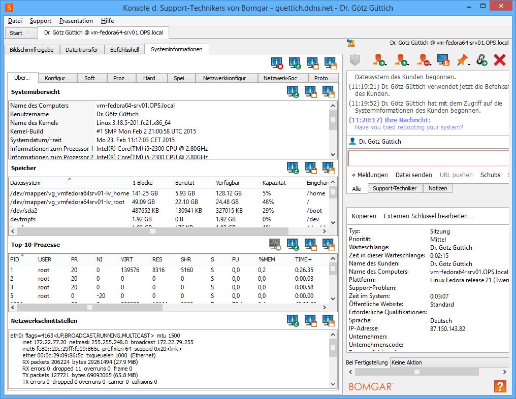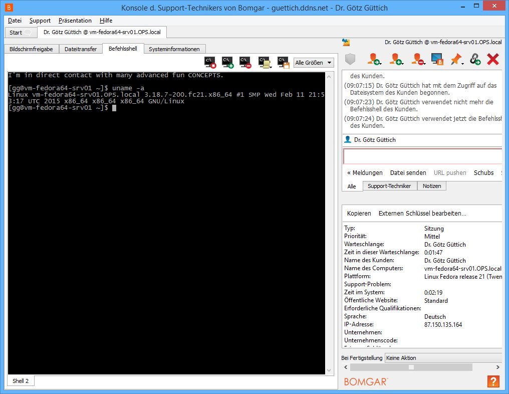 Im Betrieb konnten wir uns schnell in der Konsole zurechtfinden und problemlos mit allen Funktionen der Bomgar-Lösung arbeiten. Das gilt sowohl für die Konsole selbst unter Linux, MacOS und Windows als auch für die verschiedenen Clients, die wir ebenfalls unter Linux, MacOS und Windows fernsteuerten. Sowohl die Bildschirmfreigabe, als auch der Datentransfer, die Kommandozeile und die Systeminformationen funktionierten sofort wie erwartet und auch die Chat-Funktion ließ keine Wünsche offen. Die Remote Control-Lösung funktionierte vollkommen nahtlos über alle Systemgrenzen hinweg und die Einarbeitungszeit war aufgrund des klaren Aufbaus minimal. Treten doch einmal Unstimmigkeiten auf, so hilft die umfangreiche Dokumentation schnell weiter.