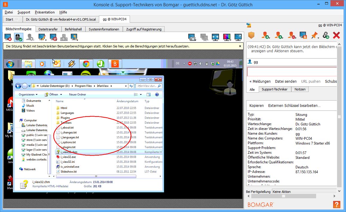 Klickt der Techniker auf einen Sitzungseintrag oder nimmt er eine Sitzungsanforderung an, so öffnet sich ein Sitzungsreiter, über den sich die einzelnen Fernwartungsfunktionen von Bomgar nutzen lassen. Das wichtigste Feature in diesem Zusammenhang ist sicher die Bildschirmfreigabe. Hier können die Techniker die entfernten Rechner steuern, Probleme beheben, Software installieren und ähnliches. Direkt nach dem Verbindungsaufbau läuft die Session im Fenster standardmäßig mit den Rechten, des auf dem Client-System angemeldeten Users. Benötigt der Support-Mitarbeiter zum Erledigen seiner Aufgaben Administratorrechte und hat der lokale Anwender diese nicht, so kann er durch den Klick auf eine Schaltfläche und die Angabe der Administrator-Credentials erweiterte Rechte erlangen. Alternativ ist es auch möglich, die erforderlichen Zugangsdaten vom Benutzer auf dem entfernten System eingeben zu lassen.