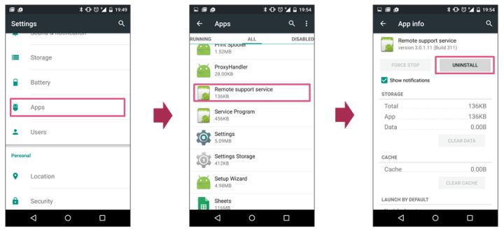 - Beeinträchtigt: Auf dem Gerät ist bereits das gefährdete Plug-in installiert und es ist auch eine Drittanbieteranwendung vorhanden, die das Plug-in ausnutzt. In diesem Fall ergibt es Sinn zu versuchen, das gefährdete Plug-in mithilfe folgender Schritte zu entfernen: Einstellungen –> Apps –> Gefährdetes Plug-in lokalisieren und anklicken –> Deinstallieren anklicken. Danach: Versuchen, die beeinträchtigende App zu lokalisieren und deinstallieren. Wurde das Plug-in allerdings auf dem Gerät vorinstalliert, hat man wahrscheinlich keine Möglichkeit, es zu deinstallieren. Hier muss man sich an den Gerätehersteller wenden und nach einer Lösung fragen.