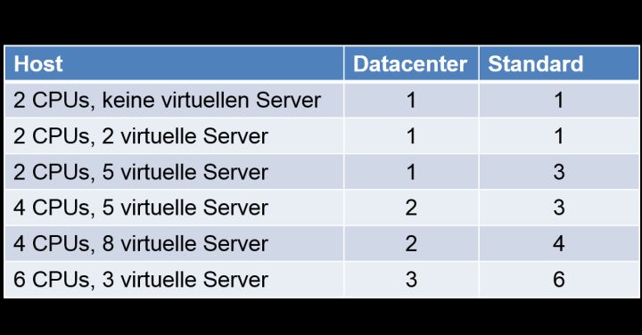 Entscheidet sich das Unternehmen hingegen für die Datacenter-Edition, genügen drei Lizenzen – gleichgültig in welcher Konstellation die virtuellen Server auf den Hosts aktiv sind. Allerdings ist die Standard-Version wesentlich preisgünstiger. Es empfiehlt sich also, eine langfristige Planung aller zu virtualisierenden Server zu erstellen und darauf basierend einen Preisvergleich durchzuführen.