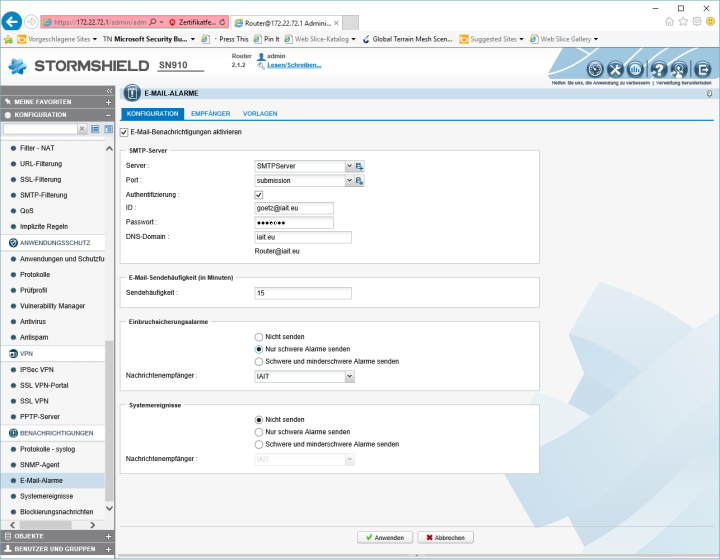 Ebenfalls von Interesse ist die Konfiguration der Benachrichtigungen. Unter „Syslog“ geben die zuständigen Mitarbeiter einen Syslog-Server an, auf dem die Appliance Systemmeldungen hinterlassen kann. Außerdem unterstützt die Lösung unter anderem auch SNMP und E-Mail-Alerts. Der Punkt „Benachrichtigungen“ schließt den Funktionsumfang des Konfigurationsmenüs ab.