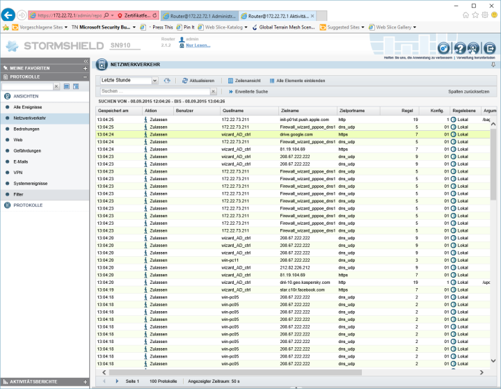 Die Logs umfassen unter anderem Systemereignisse und die Protokolle bieten Aufschluss über den Netzwerkverkehr, aufgetretene Bedrohungen, die VPNs und vieles mehr. Sie ermöglichen es den zuständigen Mitarbeitern, sich umfassend über den Sicherheitszustand in ihrem Netz zu informieren. Alle Einträge liegen in Listenform vor und lassen sich filtern und durchsuchen.