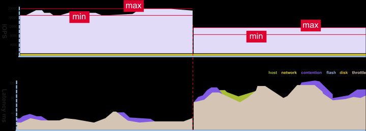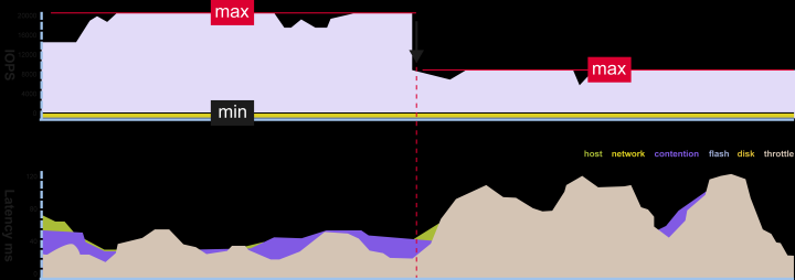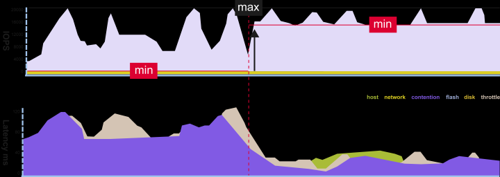 Ein anderes Beispiel: Viele Unternehmen haben einige Server und Applikationen, die als absolut wichtig gelten und deren VMs jederzeit höchste Performance garantiert bekommen sollten. Läuft eine solche VM langsam, muss der Fehler schnell gefunden und behoben werden. In unserem Beispiel reicht ein Klick auf die VM, um zu zeigen, dass eine Contention-Latenz besteht, dass sich die VM also quasi mit einer oder mehreren anderen VMs um IOPS streitet. Genauso einfach, wie man ein Maximum für wilde VMs setzen kann, kann man mit einem VM-zentrischen Speicher auch ein IOPS-Minimum garantieren. Das Prinzip bleibt das gleiche: Mit einem Rechtsklick auf die VM kann man QoS einstellen und ein Minimum setzen. Damit ist der Streit um Ressourcen beendet, und die wichtige VM läuft wieder einwandfrei.